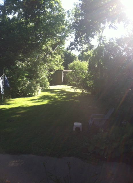 It’s a perfect early summer morning here. Lush and green and pink with roses, rich with birdsong and sunlit through the maples.  It feels like every summer morning of my early life, growing up in a small town in South Jersey or early days in Philadelphia.  Humidity has its gifts, especially in the morning before the heat comes on.  The grass is wet and fragrant, and everything green glows with plumpness. Just now, hanging some jeans on the line (that I can be sure will take all day to dry in this ninety-two percent humidity), I was struck by this full sensory beauty.  I’m relishing it, the morning’s coolness, the windows open, the shifting shadows of leaves on the screens and the brick wall of the house next door.